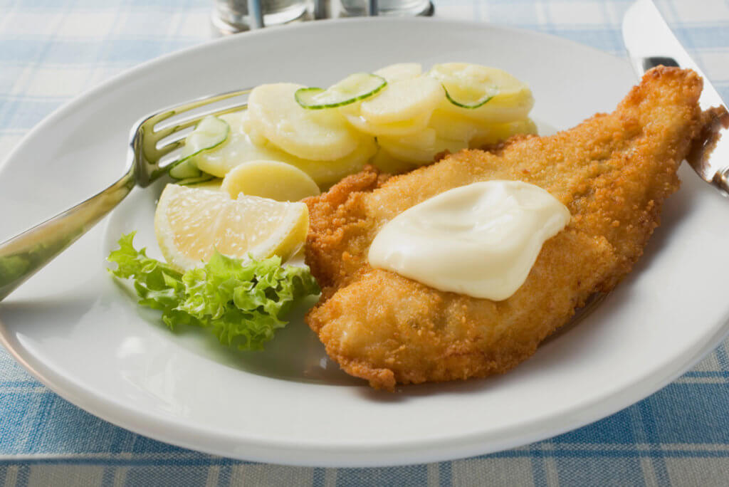 7. Rántott hal 194kcal/100g, majonézes burgonyasaláta 176kcal/100g