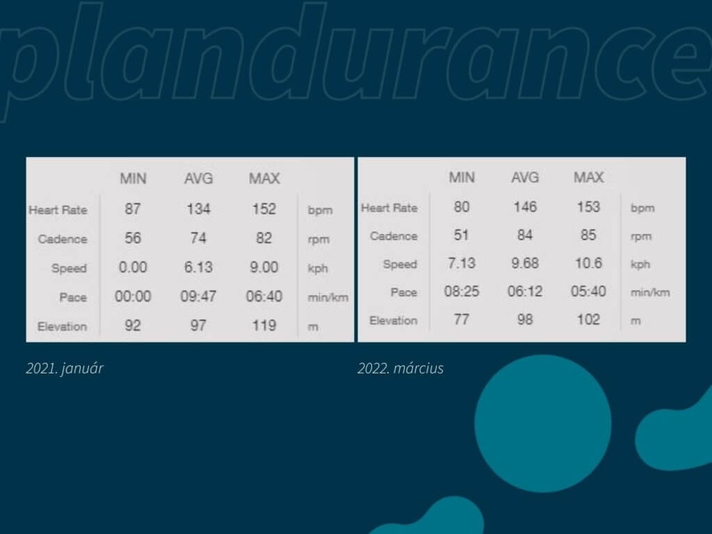 Az induláskor ébredési pulzussal határoztam meg az anaerob küszöbét, ekkor az alap-állóképeségi intenzitása 134-138 ütés közé esett, amihez 9:20-as tempó tartozott.