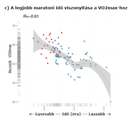 Ahogy olvashattad, úgy írtam, Kipchoge „nagyjából” az egyéni VO2Max értékének 80%-án futja a maratont. Azért fontos, hogy nagyjából, mert mindenkinél más ez az érték %-osan is, még egy ugyanazon távon, vagy időre vetítve is. Edzettség és genetika kérdése leginkább. Minél jobb egy futó, annál jobb tempót tud futni a VO2Max értékének relatív %-ával és persze a maximummal is. Viszont érdekes módon nincs egyértelmű korreláció a versenyeredmények és a VO2Max között, ezt az alábbi ábra szemlélteti is. A magasabb abszolút és relatív értékek sem jelentenek biztosan jobb eredményt. Azért, mert a teljesítménynek számtalan összetevője van és bár az oxigénfelvétel fontos, messze nem minden!