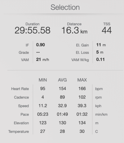 Az eggyel magasabb áttétellel már nagyságrendi az ugrás, azt nem tudnám, nem hogy 30 percig, de szerintem 10 percig sem megtekerni. Szabival egyeztetve lehet, hogy oda kellene egy finomítás és egy másik hátsó fogassorral a köztes átmenet is kitekerhető lenne előbb-útóbb, a 87-90 közötti pedálfordulat nem tragédia. Jobboldalon mutatom a 30 perces érdemi rész adatait, de adatbuzulós kollégáknak katt az alant elhelyezett fullos Garmin Connect edzésre.