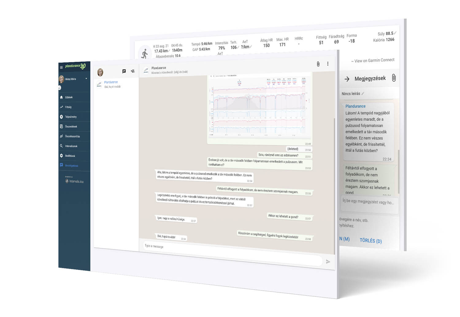A közös munka során számos alkalom lehet, amikor szeretnéd te is nyomon követni, hogy hol tartasz, készen állsz-e egy versenyre, hogyan fejlődtél az elmúlt időszakban. A Plandurance360 alkalmazásban ezek az információk immár nem csak az edződ számára elérhetők! Minden fontos információt megmutat, több mint 50 féle adat érhető el, melyek segítenek edződnek is, hogy még inkább tudja finomhangolni edzéseidet. Egy komolyabb óra edzésadataidból akár ötven féle diagramot is képes kreálni az elemzéshez.
