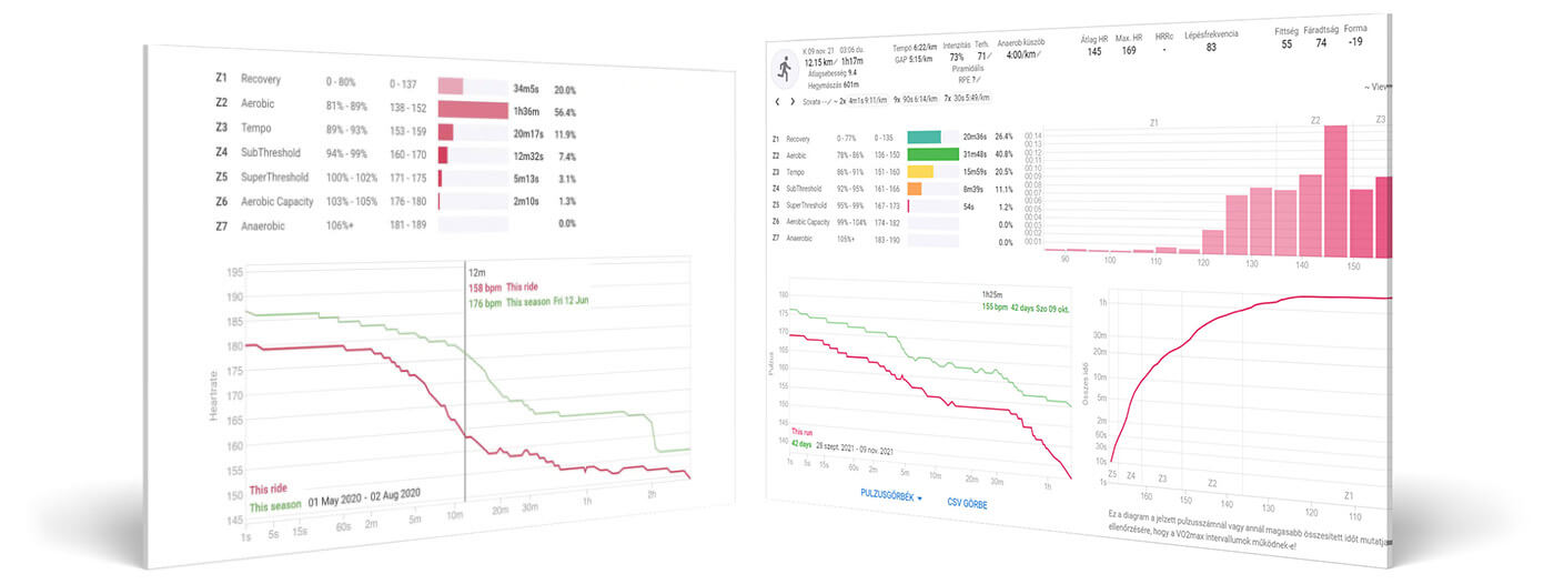 Az egyes tevékenységek végén pontosan látni fogod, hogy mennyi időt töltöttél az egyes pulzuszónákban, mindezt percben és százalékban is kifejezve, ráadásul diagramon is követheted a zóna eloszlások időbeli alakulását. Fejlődésedet itt is tetten érheted, hiszen ezeket az adatokat korábbi időszakok görbéivel is összehasonlíthatod.
